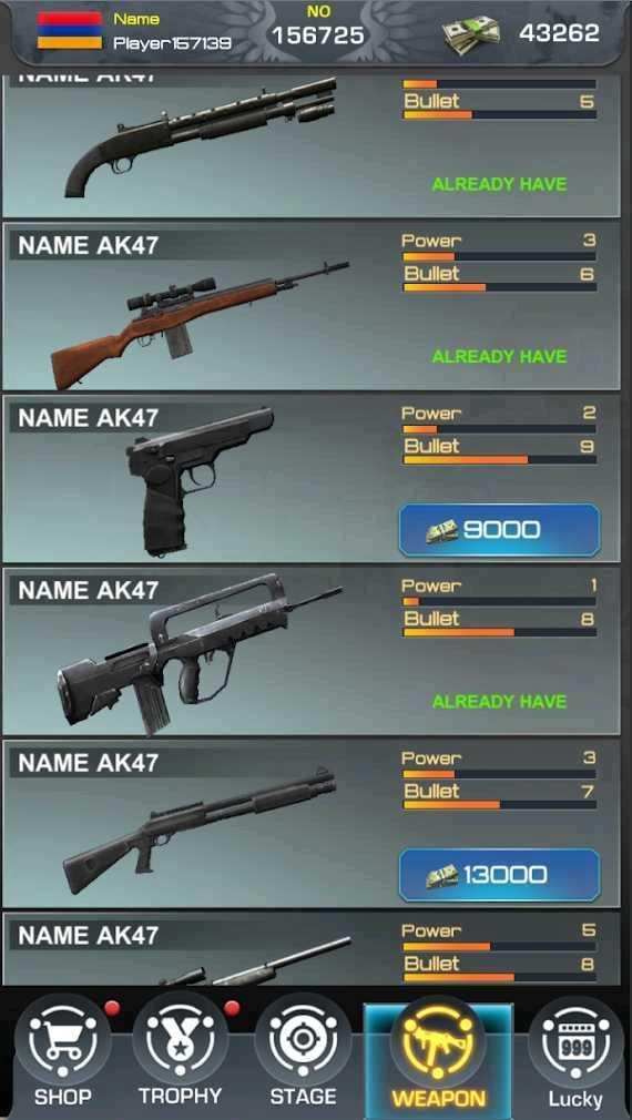 射手自由射击(足够钞票使用强加)修改了在使用钞票购买武器时,足够钞票购买,钞票会不减反加。这是一款全新打靶玩法的射击闯关游戏,游戏的画面很精致,玩家在游戏中需要将所有的目标全部击中才能顺利过关。游戏中的关卡十分的多样,操作也很简单,体验丰富有趣。喜欢这种打靶射击闯关玩法的小伙伴赶紧下载游戏来玩吧。