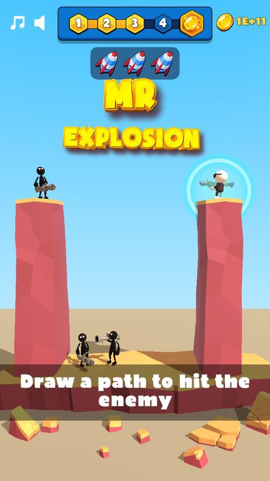 爆炸先生是一款画线射击游戏,玩家需要在屏幕上绘制线路,让火箭沿着绘制的线路飞行,以到达敌人所在的位置来清除敌人,游戏为大家修改为无限的金币,您在射击敌人的时候,要注意避免伤害到自己,同时火箭的数量有限,尽量要减少浪费才行;