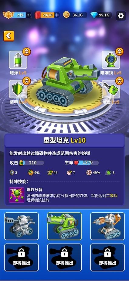 坦克升级:完成关卡获得碎片,升级坦克部件;