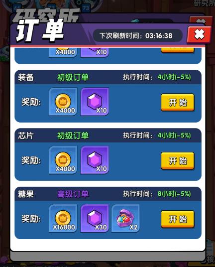 而四个小分项升级的效果就是减少对应订单的执行时间,同时最多执行一个订单任务,优先接取紫色的高级订单,不仅可以获得金币,宝石,还可以获取到特定的资源!