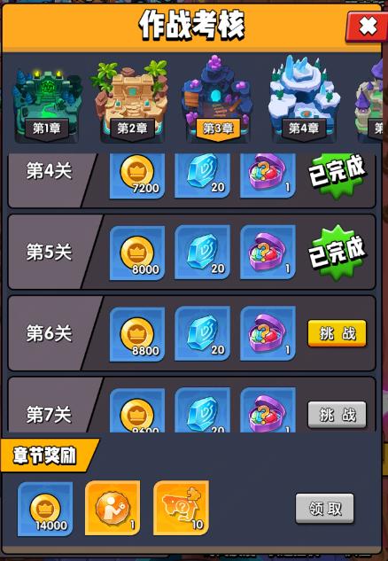 作战考核是挂机系统里面一个需要手动挑战的玩法,在每个章节里,分为10个小关卡,在通过每个小关卡的时候,都可以获取到不菲的金币与能源矿,还有不少可供玩家吞噬的糖果,这些都是玩家所需的重要资源。