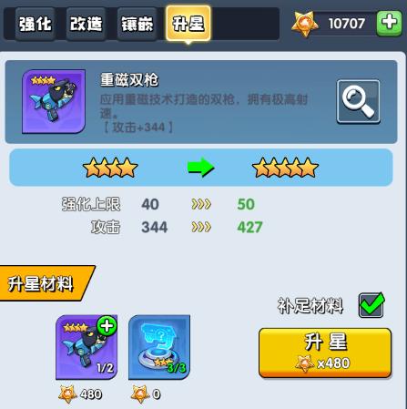 在初期橙装获取比较困难的情况下,紫色装备是比较推荐暂时培养起来使用的,其中比较适合符卡的武器为重磁双枪,前期不要吝啬强化消耗的金币,强化等级跟着人物等级走即可,然后升星的话也推荐直接升星,因为升星之后的紫装用途也很多,例如拿来给橙装升星,或者拿去开矩阵等,不会造成浪费。如果升星材料不足,可以使用能量值进行补足,只要推图足够勤快,分解获得的能量值一般都是够用的。