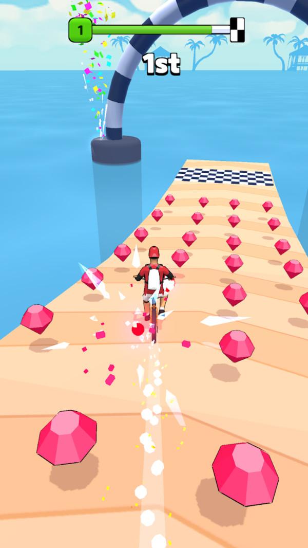 单车水上漂是一款竞速赛车游戏,游戏操作非常简单,玩家只需要滑动屏幕避免单车撞到障碍就可以了,尽量多走捷径,让您的单车超越其他人快速到达终点,这样就能够赢得胜利,并收集钻石道具,解锁更多的皮肤来使用。