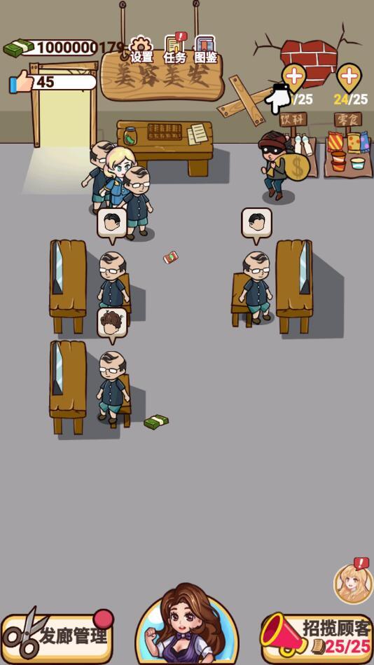 该理发了游戏给大家破解成无限的钞票,这是一款模拟经营理发店的游戏,玩家需要聘请理发师,招募员工,购买理发台等设施,吸引更多的客人前来理发店理发,并设计出客人喜欢的发型,解锁更多的顾客前来您的理发店剪头发;