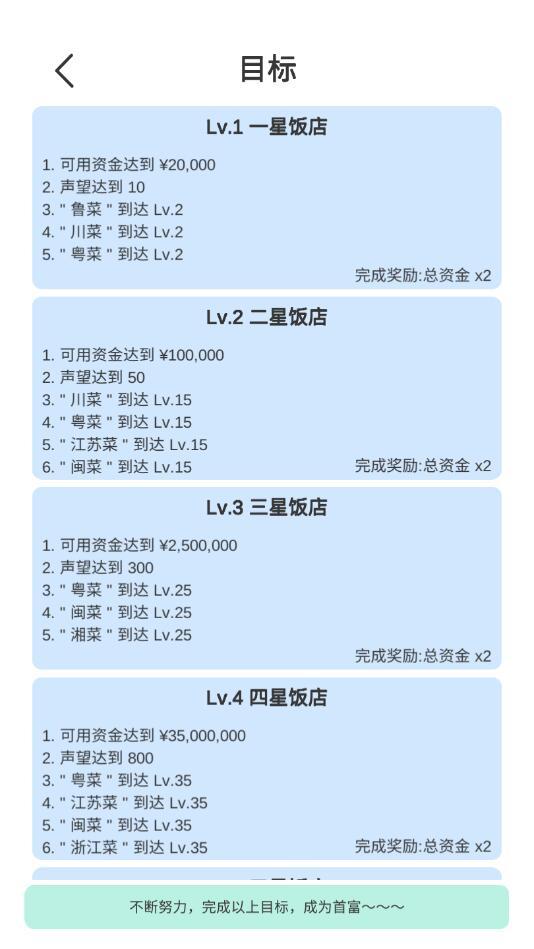 玩家需要不断去升级菜系从而解锁(收集)更多菜谱继而赚钱更多利润。