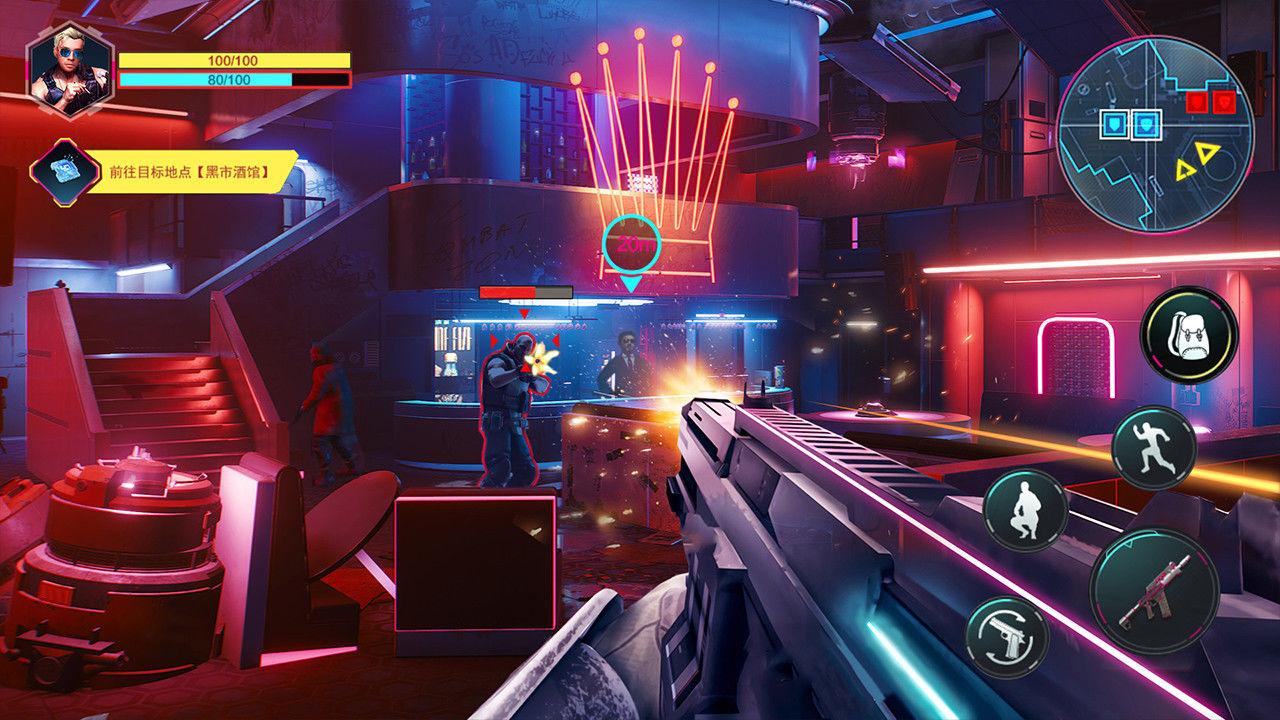 1、光彩动人的赛博朋克风画面呈现,置身于人类未来的大都市之中开启动作冒险之旅。