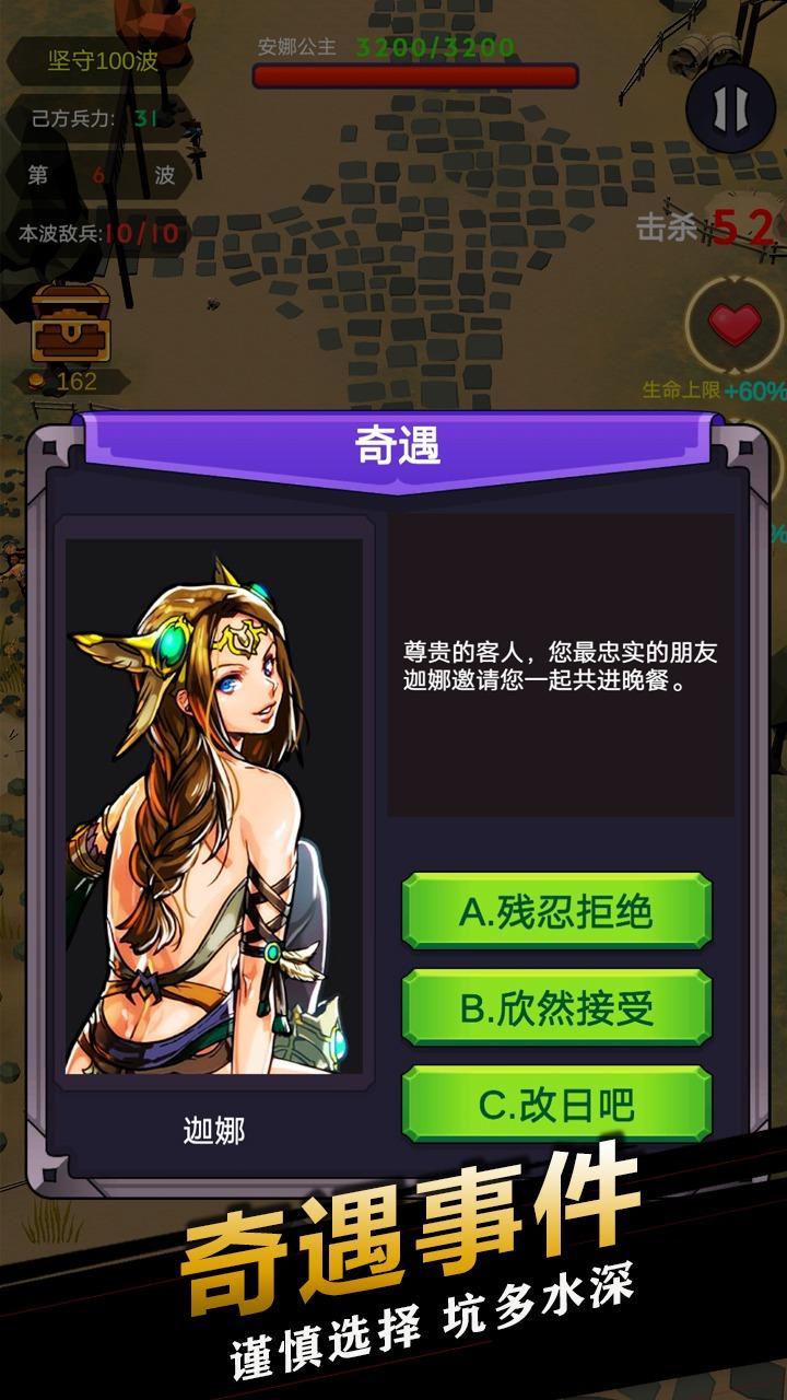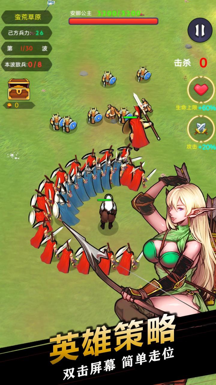 首先是这款游戏整体的一个玩法,这款游戏本身的玩法相对来讲,在刚开始体验的时候还是让人觉得有一定的新鲜感的,在游戏中你是化身为保护公主的骑士,你需要操控自己的人马,进行一个合理的排兵布阵,为公主阻挡各方面的攻击,从而一路保护公主,成功的到达某个地方,这样的一个玩法玩起来的感觉,在刚开始的时候确实是特别的新鲜,比如说像是对人物的一个指挥操作,然后看我方将敌人击杀时的那种舒适的感觉,然后游戏中又有着像是每当你闯过一波敌人之后,给你一个随机的加成什么的,看上去确实是挺不错