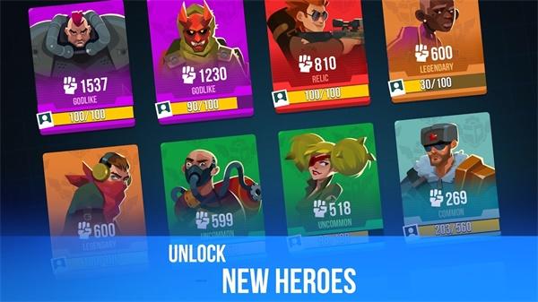 3、精美的卡通风格和独特的英雄系统,让你能够和其他玩家展开更多的竞技对决。