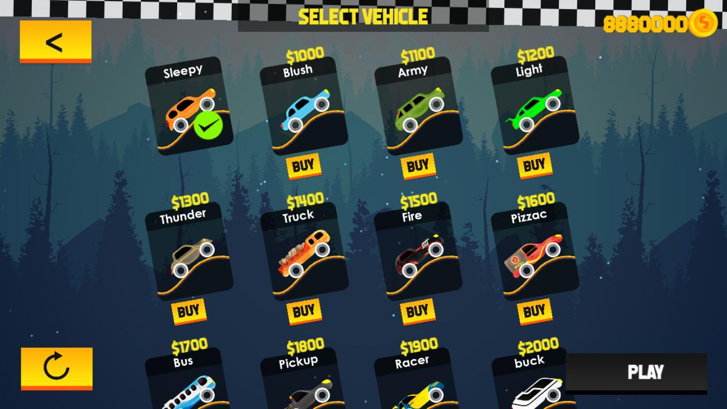 爬坡赛车游戏给大家破解成大量的金币,玩家可以使用金币来解锁各种车子,这是一款平台驾驶闯关游戏,玩家要控制赛车在崎岖的山路上行驶到终点,不能让车子翻车,道路上还有障碍考验着您,虽然操作简单,但是玩法很有趣;