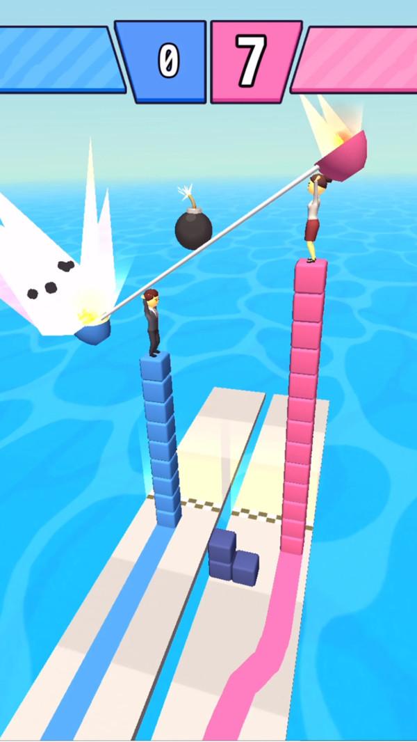 炸弹对对碰的游戏玩法非常的有趣,你需要控制你的小人和对面的人进行对抗,在你们之间有一个炸弹,随着你的前进你可以不断地收集各种对应颜色的方块让自己的角色站的更高让炸弹流向对面的人引发爆炸获得胜利。