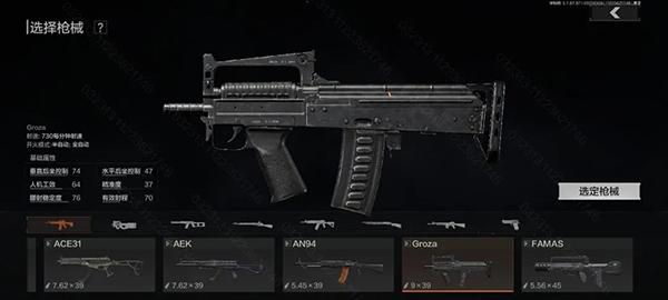 白狼提供的武器则为GROZA突击步枪,使用9×39毫米口径弹药、枪械采用无托设计,以成熟的AKS-74U突击步枪为参考,定位和比较类似,射速虽不及VSS,但也比其他大多数突击步枪更快,同时也比VSS更容易控制后坐。