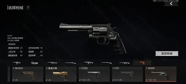首先新增的是一把转轮手枪M300,它使用7.62×54毫米大口径弹药。枪械后坐力较大,同时可以使用长枪管并且兼容各类高倍镜。但是弹巢和枪管间较大的缝隙导致的气密性问题,使得枪机能量转化效率和射击精度有限。