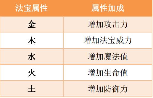 目前,法宝的属性分为5类:分别为金、木、水、火、土。
