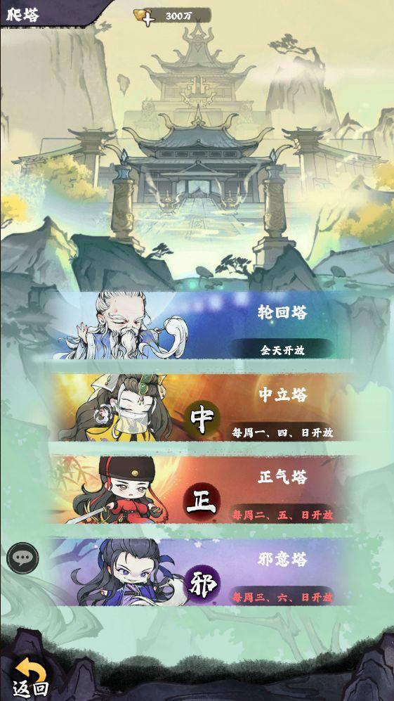 爬塔系统包含四个塔,分别是轮回塔、中立塔、正气塔和邪意塔。每个塔都有不同的挑战和奖励。除了轮回塔,其他三塔都需要玩家属于对应的阵营才能进行挑战。