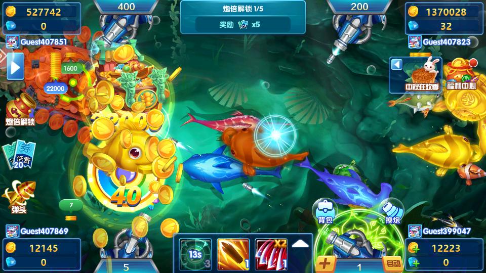 1、千万倍率:五种鱼炮,千百倍率随意切换,捕鱼也要有特色