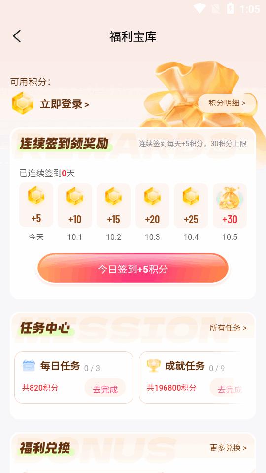 2、进入到福利宝库可以看到积分和任务等功能。