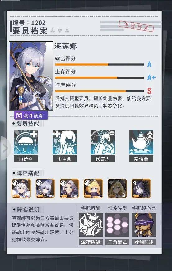 推荐理由:海莲娜是海氏三姐妹中的二姐姐,海氏集团的形象代言人。温润柔和的的海莲娜以海氏的名义举办各种慈善活动,帮助伊甸要塞内遇到困难的人。海莲娜的一技能可为我方生命值最低的要员进行治疗,并有概率解除该要员所有的负面状态;海莲娜的二技能可为我方4个生命占比最低的要员进行治疗,并且有概率净化掉2个负面状态。海莲娜无时无刻都散发着柔和的光芒,每回合开始的时候为所有的要员添加效果抵抗和免伤提升效果,并有一定概率净化一个人的一层减益效果。