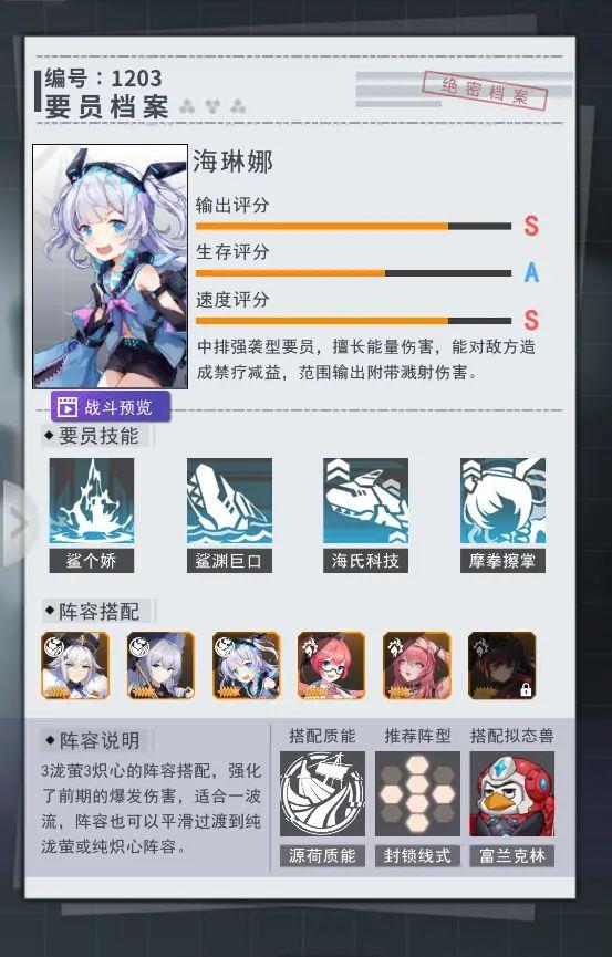 推荐理由:海琳娜是海氏三姐妹中的三妹妹,海氏集团的小公主。出于对她的保护,海氏集团给她做了一整套的机械鲨鱼套装!海琳娜的一技能,是用自身的高强度伊甸合金砸向敌人,对地方前中排4名敌人造成大量能量伤害,并对强袭和防卫型有额外增伤效果。海琳娜的二技能,是对离自己最近的敌人,造成大量的能量伤害,并对周围敌人附带真实溅射伤害。海琳娜天生调皮,战斗的时候总能出其不意。若海琳娜站在前中排,可提升自身的伤害,若站在后排,则有大概率触发暴击!