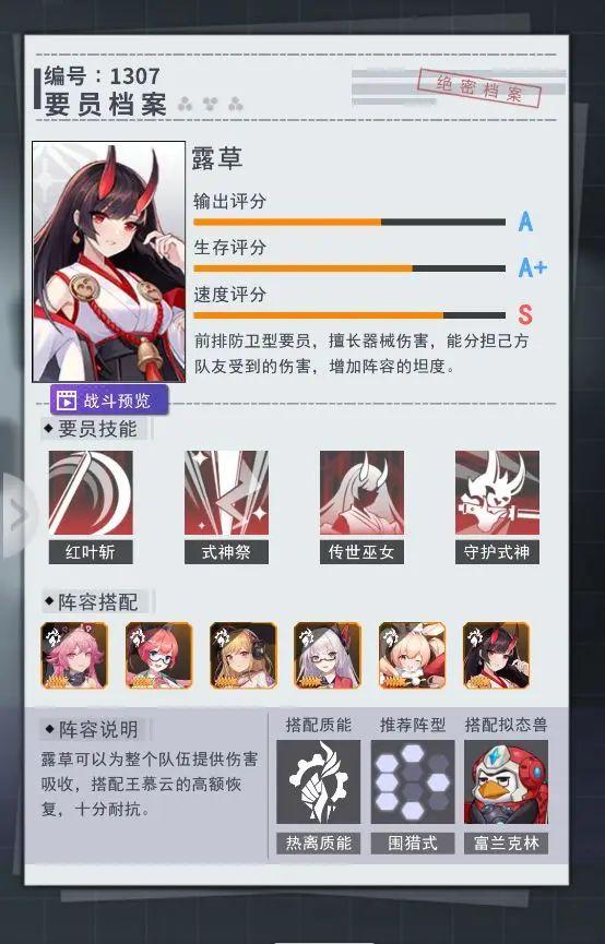 推荐理由:炽心阵容万金油输出。二技能歼星炮最高拥有超高的单体爆发伤害,而且对付低血线的敌人还有增伤效果,而且不依赖于敌人的状态环境,可谓是一个万金油输出。不过伊万杰琳每释放一次歼星炮,就会无法行动一回合,但未行动过的伊万杰琳,下回合将会对敌人造成更高的伤害!