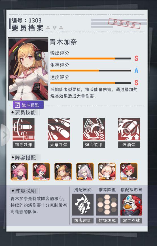 推荐理由:炽心阵容绝对输出核心。持续5个回合的无CD直线能量伤害,和对灼烧状态的敌人造成无视防御力的伤害是她的核心输出手法,主打一个高爆发。