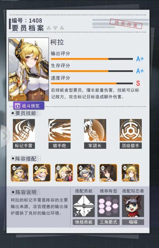 推荐理由:联盟政府的高级军官,经常出现在战场一线指挥战斗。柯拉的一技能,是向着敌人投掷出一颗标记手雷,对前中排所有敌人造成能量伤害并有概率附加“猎标”——防御力下降的状态。柯拉的二技能是让自己忠诚的机械猎犬进入战斗状态,对前中排随机敌人造成能量伤害。若敌人处于“猎标”状态,则柯拉造成的伤害还会有额外的提升。