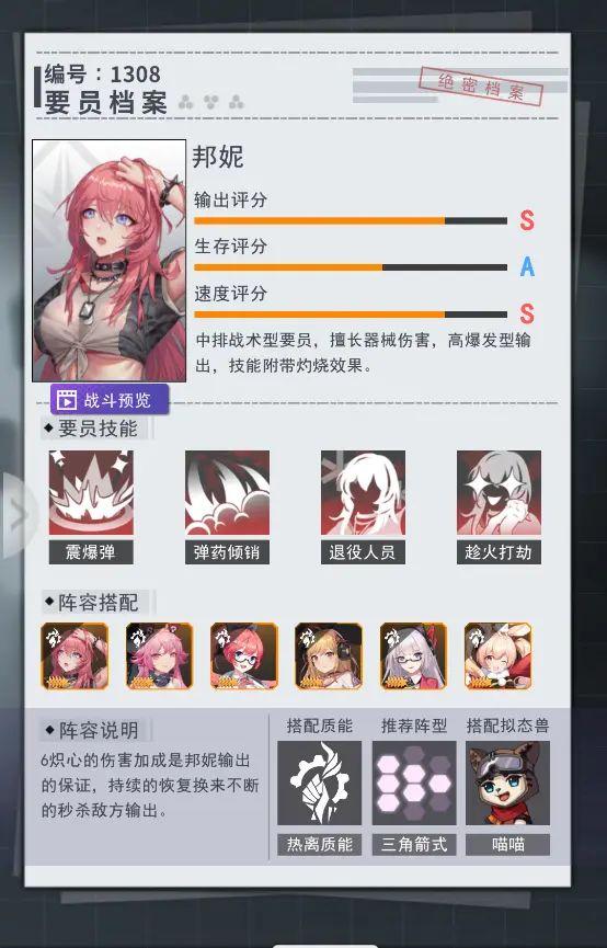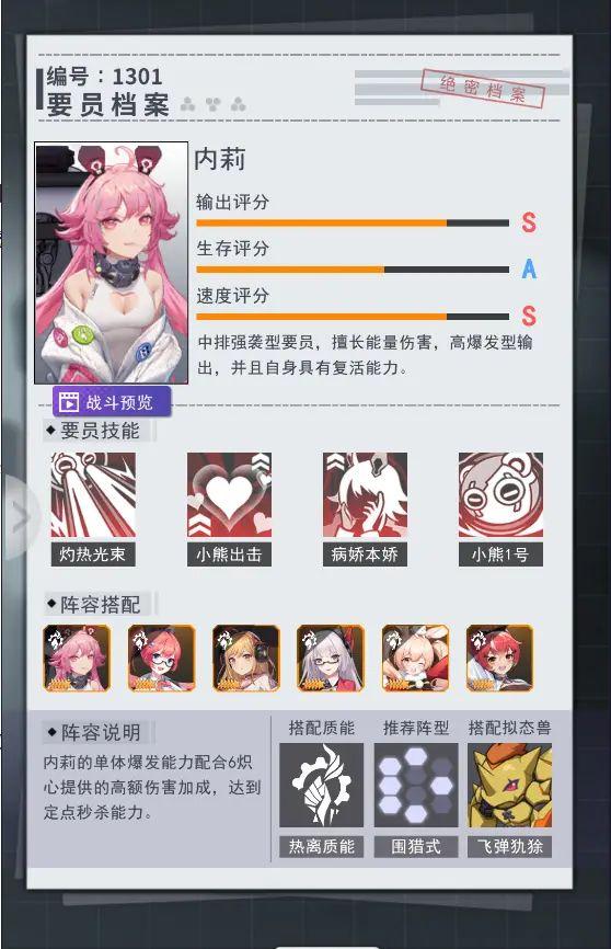 推荐理由:内莉的灼烧小挂件,一技能和二技能都有大概率让随机多名敌人附上灼烧状态,而自身对灼烧状态的敌人也有伤害加成,可谓是输出辅助两不误。