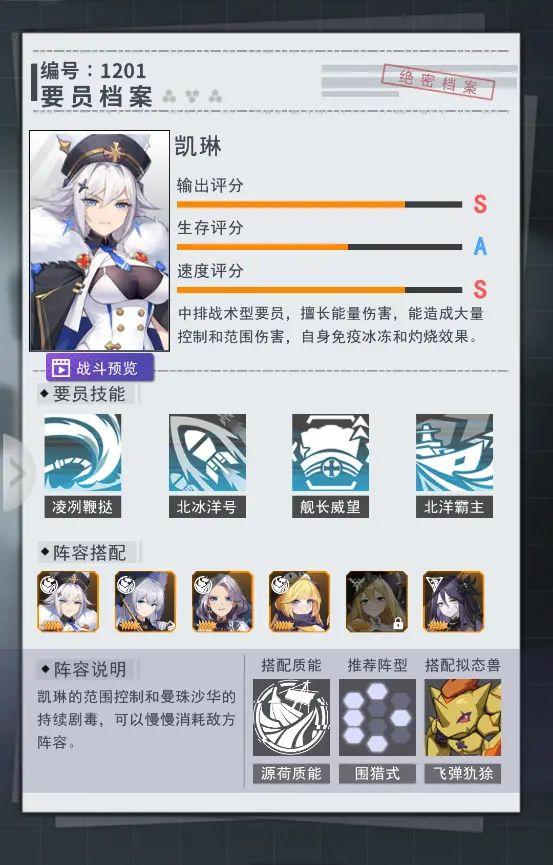 推荐理由:凯琳作为北冰洋号的舰长,是泷滢阵容中武力的绝对担当。凯琳的一技能可以对前中排4个单位的敌人造成能量伤害和减速、束缚的效果。而二技能可以对地方全体敌人造成能量伤害和速度值挂钩的真实伤害!另外,长期在冰海中航行的凯琳,免疫冰冻和灼烧的效果,且当生命值低于50%的时候,刷新二技能并再一次对敌方全体敌人造成一次真实伤害!在她眼中,真理只在炮击的范围之内。