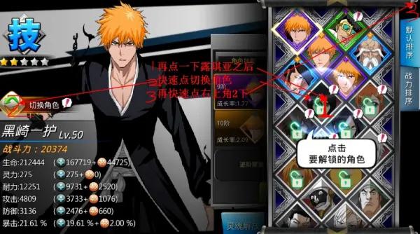 初期推荐使用角色“黑崎一护”当做闯关主力。由于完成成就可以获得很多“黑崎一护”碎片,使得大家可以很快得将“黑崎一护”升阶至较高等级,而“一护”使用“←→”+ “↑”+“↑”+“↑”+“↓”连招方法可以很快击倒对手并且“无伤”打出高额伤害,如此顺畅而又简单的连招使得“一护”在灵魂试炼中“1v1”的战斗中有着很大的优势。