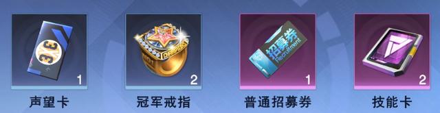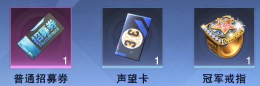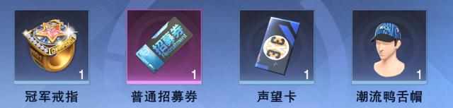 内容:冠军戒指*1 普通招募券*1 声望卡*1 潮流鸭舌帽*1