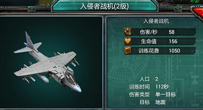 玩家的第一支飞行的攻击战斗部队,是入侵者战机。虽然生命力比较弱,还是垂直攻击的,但是它是优先攻击防御的建筑的,用防御比较厚的地面部队吸引火力再放出战机轰炸敌人的防御建筑可以起到出其不意的效果哦。