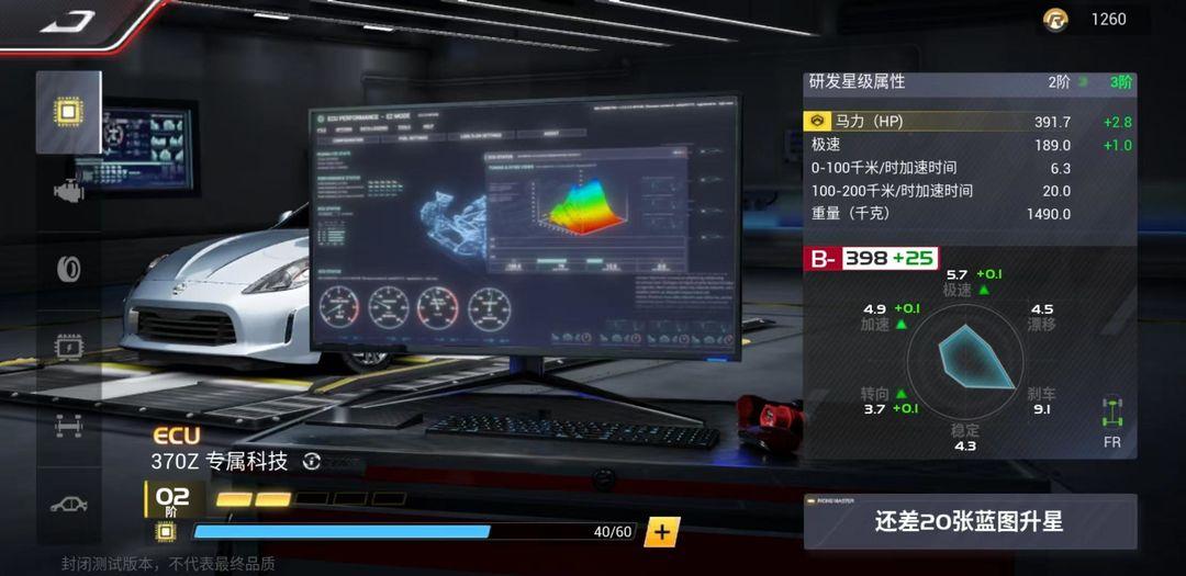 当赛车引擎升级至等级3时,除了需要金币以外还需要零件。零件的获取途径主要有四种方式,分别是:车展商店、段位提升、主线任务以及赛季合约。以370Z为例,将引擎从等级1升级到等级2:马力会从369提升至380,0-100千米/时加速时间会从6.5降低至6.4。