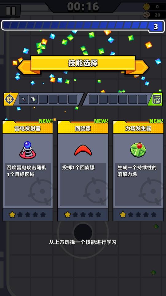 2、玩家可以从一排技能里选择一个,一旦选择以后就不能更换,除非重新开始关卡或者闯关失败后才能重新选择。