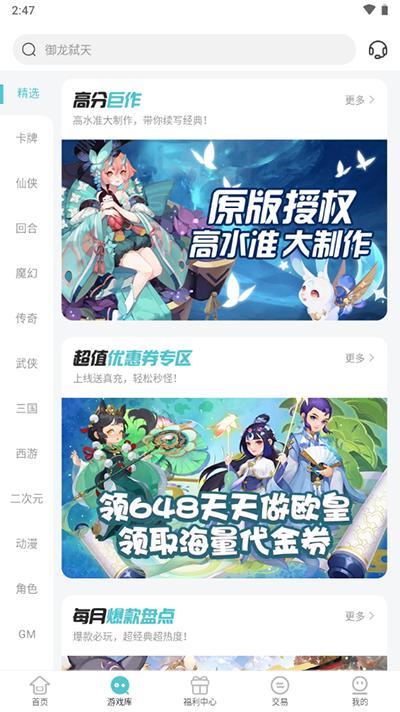 2、点开游戏库,可以查看卡牌、仙侠、回合、魔幻等多种类的手游;