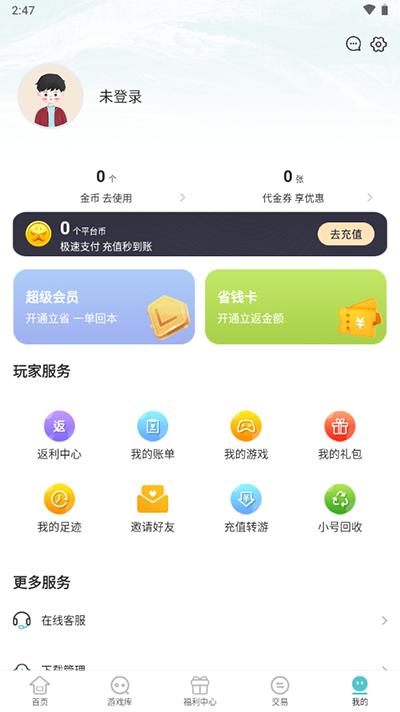 4、我的页面,玩家服务中多项功能提供给玩家可以充值转游、小号回收。