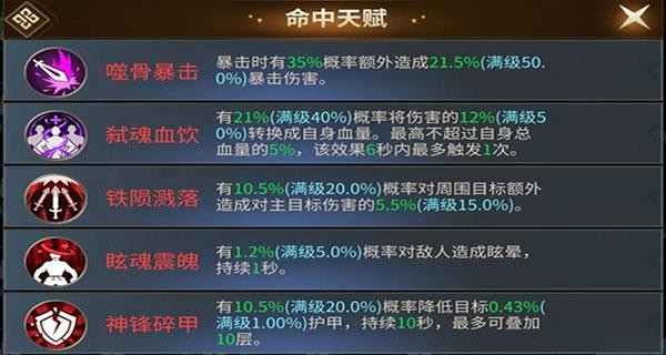 核心天赋依据使用方向分为了命中、受击、死亡、斩杀四种,每种核心天赋都有五个不同天赋可供选择。如命中天赋的“嗜骨暴击”在暴击时有概率造成额外伤害,简单暴力;“弑魂血饮”则是将部分造成伤害转化成血量,提供恢复能力。