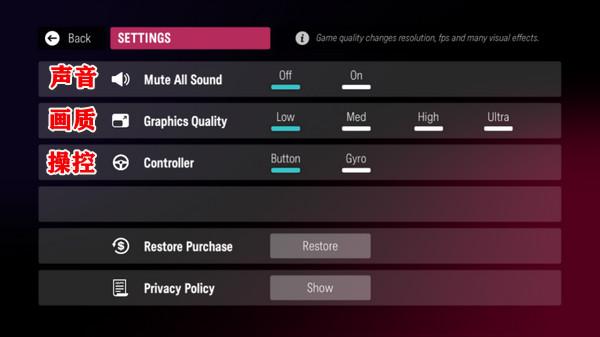 现在还没有中文设置,只有声音、画质、操作几个选项,手机好的可以把画质拉满