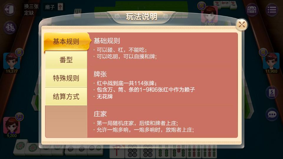 1、【玩法】:现支持广东(推倒胡、鸡平胡)、上海(清混碰、敲麻)、湖北(武汉红中赖子杠、卡五星)等各地特色麻将玩法