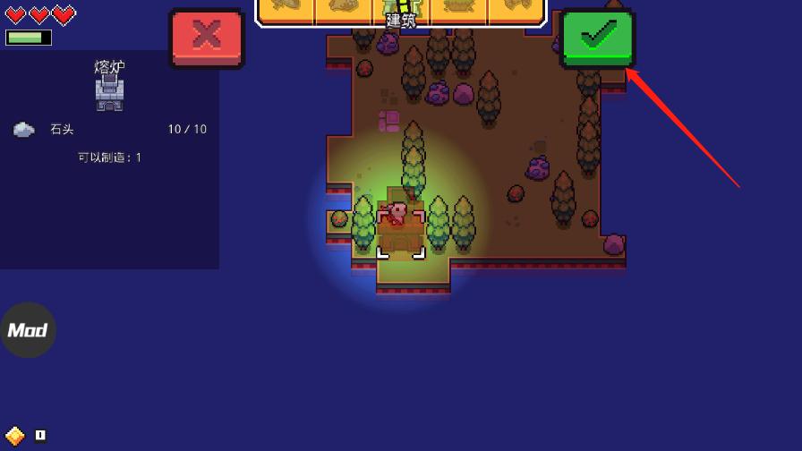 6、当石头都收集完成的时候,就可以建造熔炉,点击右上角的菜单,然后点击建筑,选择好熔炉需要放置的位置,点击【√】即可;