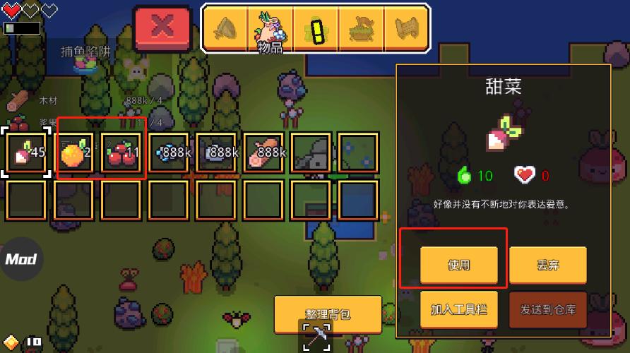 10、当下图这里变空的时候,意味着角色需要吃东西了,点开菜单,然后点击可以填饱肚子的食物,然后使用就可以恢复能量。