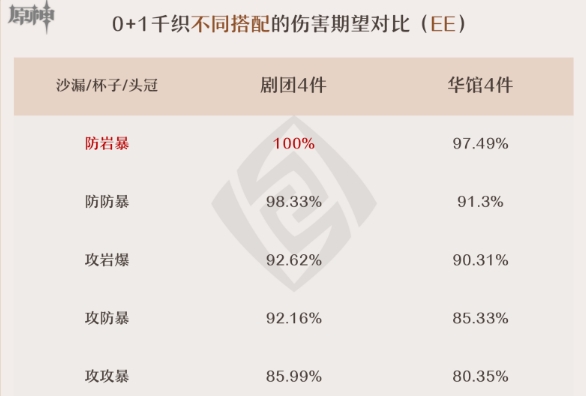 ③两种套装搭配都可以作为千织的毕业套装,主词条优先考虑“防御沙漏、岩伤杯、暴击/暴伤头冠”。